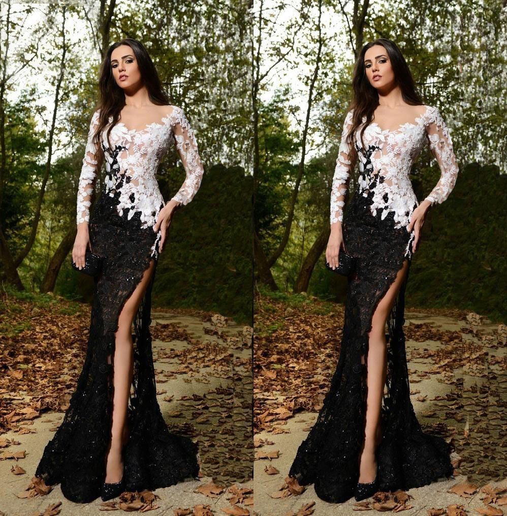2020 Rami Salamoun See Through Lace White And Black Mermaid Evening Dresses Long Sleeves Split Sexy Formal Prom Gowns From Sweet Life 143 18 Dhgate Com